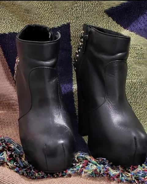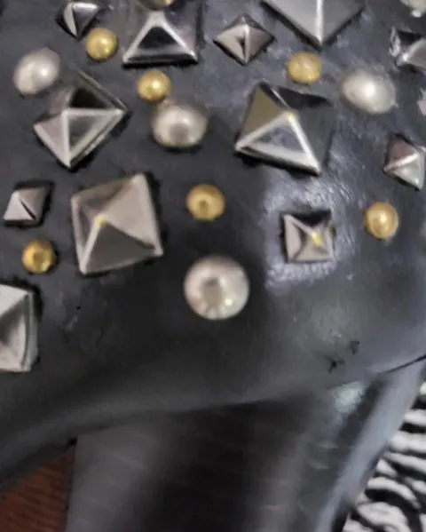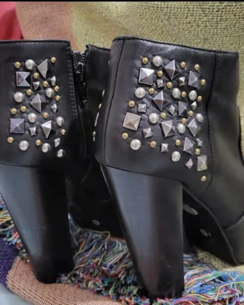 Botas de tacón y plataforma, tienen estoperoles en la parte de atrás, son súper cómodasTiene un mínimo detalle en la parte de atrás, un rasponcito que casi no se ve esta en la última fotoTacón 12cm