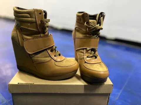 Botín beige tacón corrido, en buen estado con velcro y agujetas.