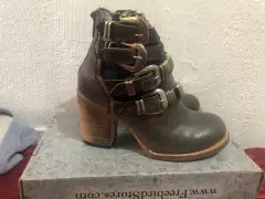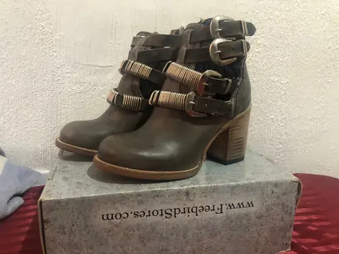 botín de dama Marca freebord by Steven. Botín para dama Marca freebord by Steven en piel color verde militar deslavado en piel con detalle de cintillos con hebillas y argollas en color plata número #23 nuevos incluye su cubre polvo a un 50% por debajo de su precio normal ($4000)