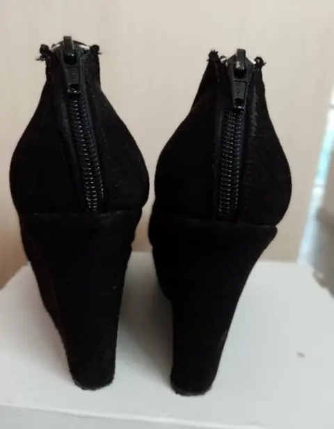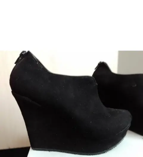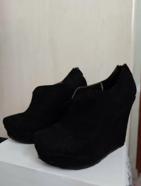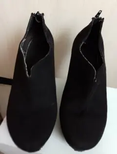 Botín color negro de ante. Tiene cierre pequeño en la parte trasera del zapato. Es de plataforma, mide 8cm de alto y la plataforma de enfrente mide 3cm. Es un poco escotado de enfrente