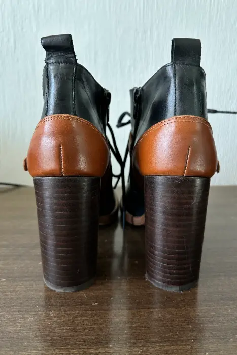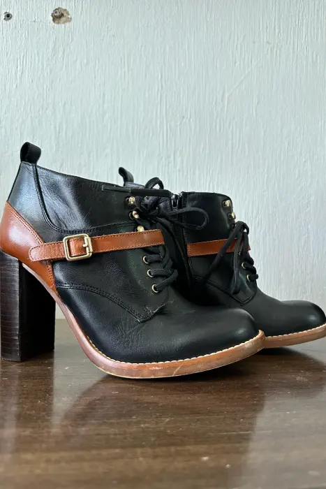 botin tacon grueso. botin de piel estilo clasico, negro con color camel y agujetas, son muy comodos y casuales, el tacon ancho te da mayor confort, estan practicamente nuevos, se pisaron solo en casa para probarlos.