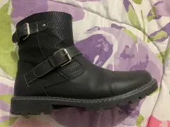 Botines talla 6 con adornos de hebillas al frente y los costados, cierre en la parte anterior, horma amplia y costura en la suela