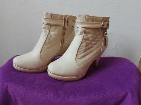 Botines color beige, cómodos, de tacón bajo, con dijes a los lados, ala moda, poca plataforma, cierre a los lados, son del número 3 y forro de vinipiel