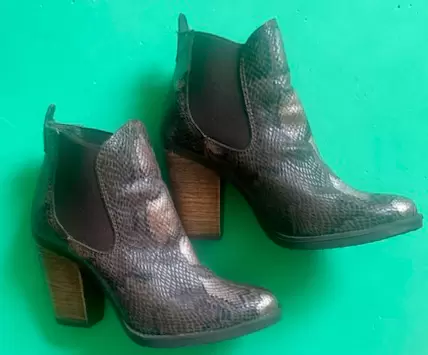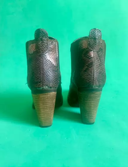 Botines animal print con estampado de víbora color café en perfecto estado, quedan justas, puede quedar a talla 5, traen banda elástica a los lados para su ajuste Talla: 5.5 Altura del tacón: 9cmMarca: Cklass