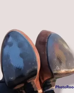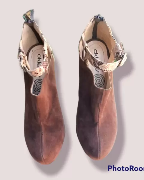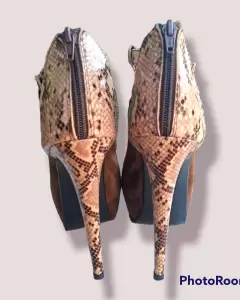 Botines con tacón de 13 cm de alto, la parte café es tipo gamuza y la parte de animal print, es tipo charol. La hebilla se puede ajustar. Usados dos o tres veces. Son altos, pero cómodos y están muy padres. Tienen el detalle, de que se han empezado a descarapelar por dentro, por estar guardados, pero por fuera estan en excelentes condiciones.