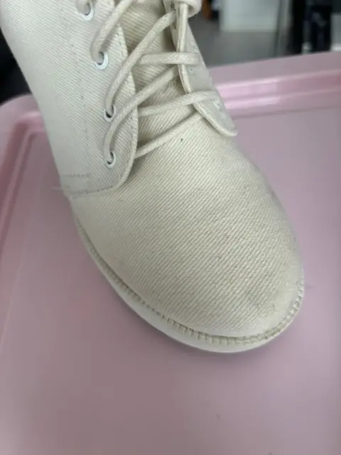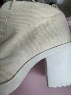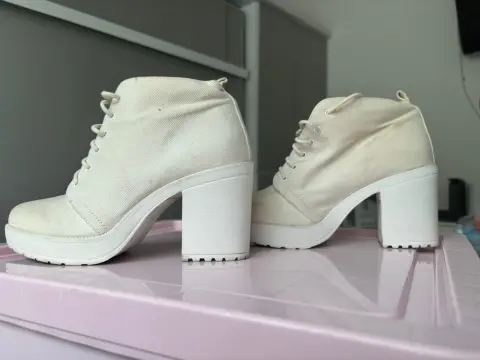 Botines blancos con detallle en la lengüeta pero queda por dentro y no se ve . Con tacón de 7 cm ancho (cómodo ), Talla 36 ( tomar como referencia tallas de Zara .material como de loneta