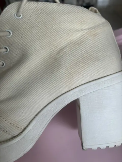 BOTINES CASUALES. Botines blancos con detallle en la lengüeta pero queda por dentro y no se ve . Con tacón de 7 cm ancho (cómodo ), Talla 36 ( tomar como referencia tallas de Zara .material como de loneta