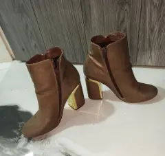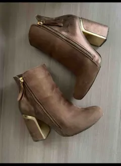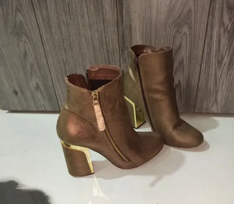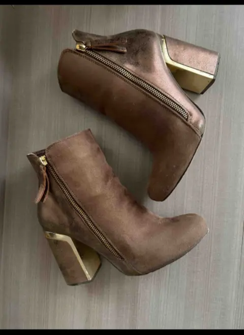 Botines cklass. Descripción:Están hermosas, se ven genial con prendas formales, tiene ya sus detalles en la parte del tacón pero aun se conservan bien, el color se ve café pero tiene un tono como verde olivo dorado