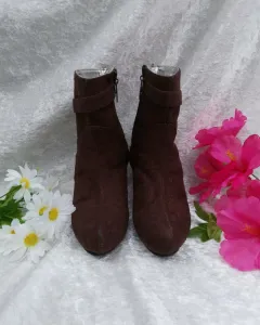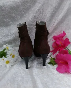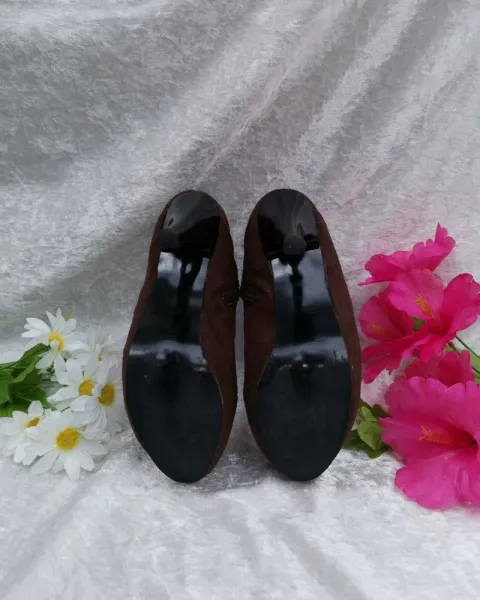 Hermosos botines de gamuza color café, ligeros detalles en la suela y tapas que no ameritan cambiarla, tacon perfecto de 10 cm, pequeña plataforma que los hace súper cómodos. Los vendo porque nunca me quedaron, aunque vienen en su talla correcta.