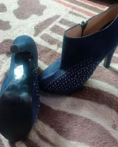 Botines de gamuza con detalle lateral en pedrería, tacón de 12 cms, cómodos. Poco uso.