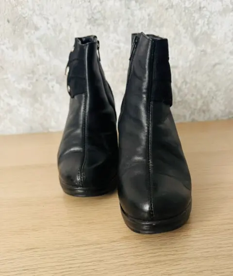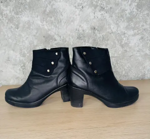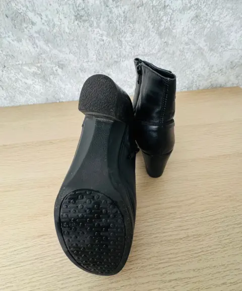 Botines negros de piel y gamuza en laSolapa Suave Pies talla 4.Se entregan en su caja original, usados una vez.Tacon de 7 cmTiene una raspadura en el talón en una de las botas