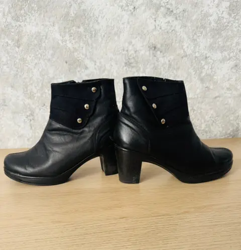 Botines de piel y gamuza talla 4 Sueve Pies. Botines negros de piel y gamuza en laSolapa Suave Pies talla 4.Se entregan en su caja original, usados una vez.Tacon de 7 cmTiene una raspadura en el talón en una de las botas