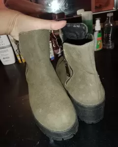 Botines color verde militar, cuenta con dos cierres uno viene solo de adorno y el otro sirve para poderse meter la bota, las botas son completamente nuevas, cabe mencionar que la bota es tipo gamuza y el tacon es de 5 cm