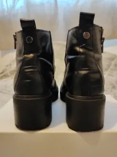 Botines Bershka color negros, suela antideslizante y en perfecto estado,con cierre a los costados. El tacón es bajo y de igual forma está parejo y en buen estado. Talla 35 osea #3Cómo detalles tiene la marca de uso en entrepeine y un mínimo despegado del costado (no afectan su uso ni entra polvo ni agua) 🖤