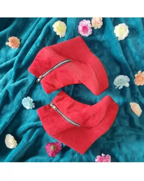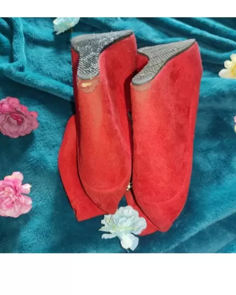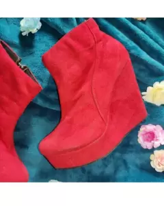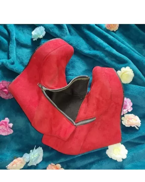 Hermosos Botines de plataforma de ante, rojos con cierre plateado, poco uso, súper cómodos.Detalle: en la parte de abajo del tacón están un poco raspados. Se ve en foto. ( se le puede pegar un detalle como una flor o algo y quedan perfectos).Envío todos los días de lunes a sábado.