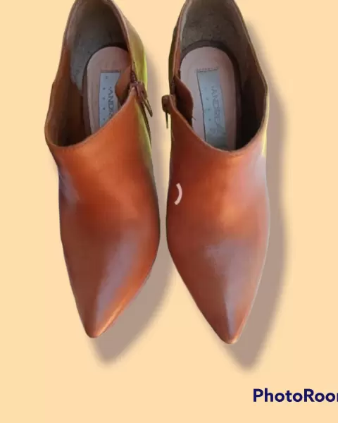 Botines de piel, color miel, tacón de 14 cm. Pocas puestas. Tienen una reparación de pintura por dentro, porque el forro se empezó a descarapelar por estar guardados, pero por fuera están en perfectas condiciones, como si fueran nuevos.