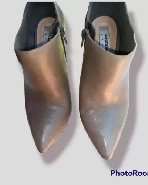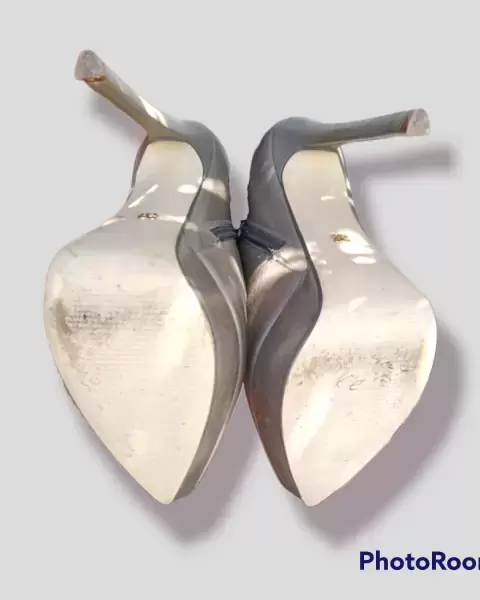 Botines de piel, color gris, tacón de 14 cm. Usados 2 o 3 veces. Tienen una reparación de pintura por dentro, porque el forro se empezó a descarapelar por estar guardados, pero por fuera están en perfectas condiciones, como si fueran nuevos.