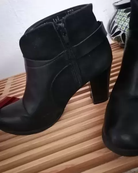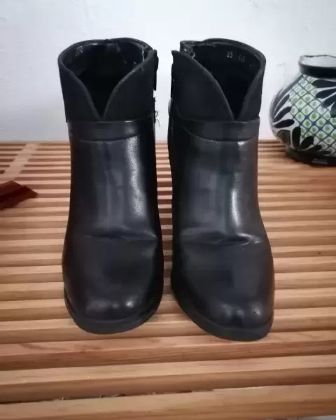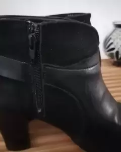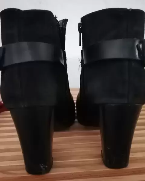 Botines en color negro, con detalle de hebilla.Mitad gamuza.Tacon aprox 8 cm.Poco de desgaste en el tacon y en la suela.