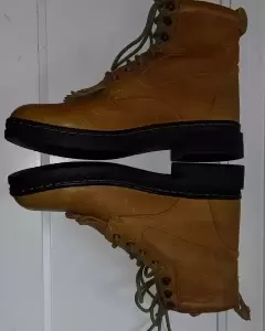 Botines de piel color cafe, decorado con flecos y borlas en las puntas de las cintas.