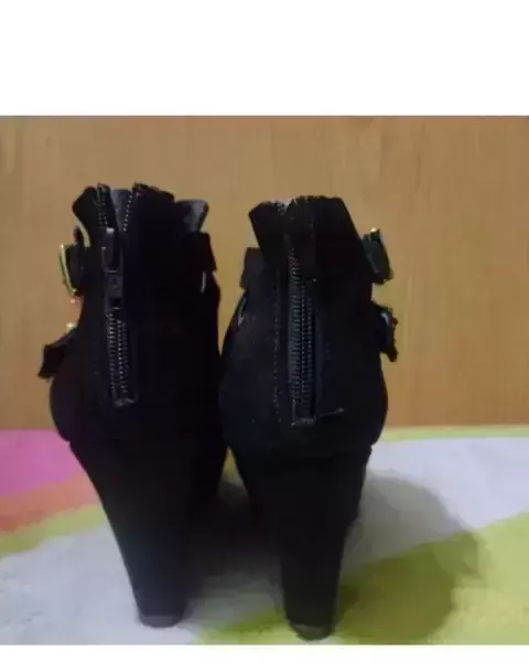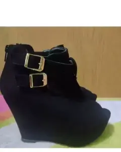 Son unos botines en #4 de tela de ante en color negro de plataforma de 11cm de altura, muy bonitos para usarlos con falda, pantalรณn o mayon muy combinables