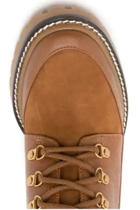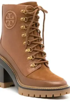 Tory Burch Miller Lug Sole Boot. De la collection icónica de Tory Burch: los botines Miller Lug Sole son utilitarios, elegantes y versátiles. Mezcla de piel y gamuza, con ojales de latón y un tacón de bloqué alto, genial para vestir con faldas y vestidos midi.