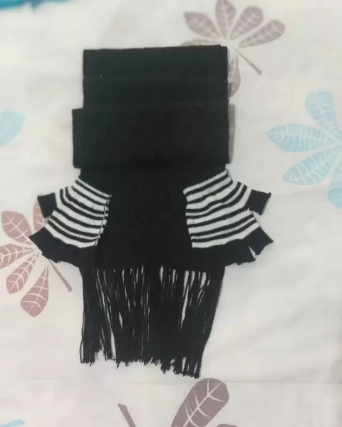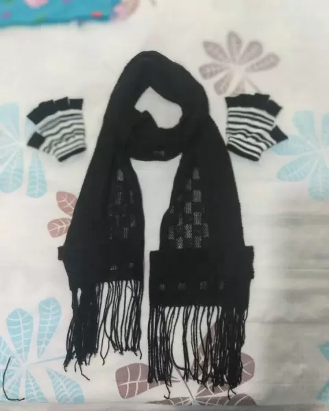 Bufanda aguantes juego útil de invierno. Bufanda y guantes, útil jurgo de acrílico y poliéster. Guantes dedos descubiertos. Talla mediana: 15 cm de alto x 10 cm de ancho. Bufanda tejida. 190cm de largo X 24 cm de ancho.