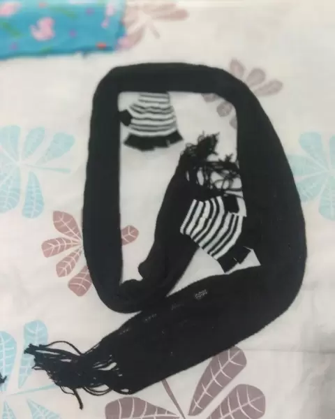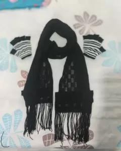 Bufanda y guantes, útil jurgo de acrílico y poliéster. Guantes dedos descubiertos. Talla mediana: 15 cm de alto x 10 cm de ancho. Bufanda tejida. 190cm de largo X 24 cm de ancho.