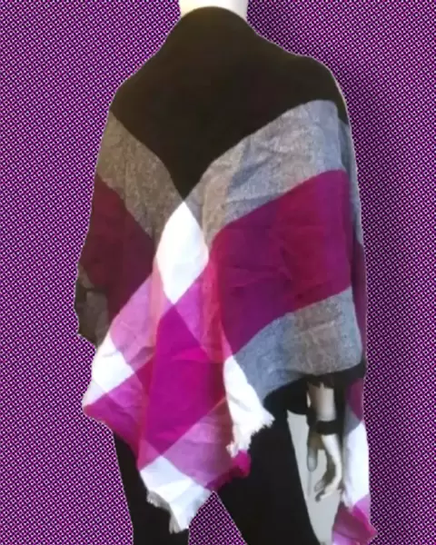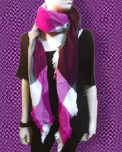 Bufanda/wrap Extra Grande Geometrica. Bufanda moderna de estilo triángulo, recortada en flecos de pestañas, colorida convinación de mezcla de color rosa intenso y rosa claro, forma ingeniosamente elegante, medida de 83 "W-38" en forma de triángulo; 1" flequillo - hecho de acrílico, lavado a máquina frío, secadora baja, lo siento, no hay etiqueta o nombre de etiqueta para aprender el nombre y la información del modelo, viene nuevo sin etiqueta como mercancía de cierre en buenas condiciones.