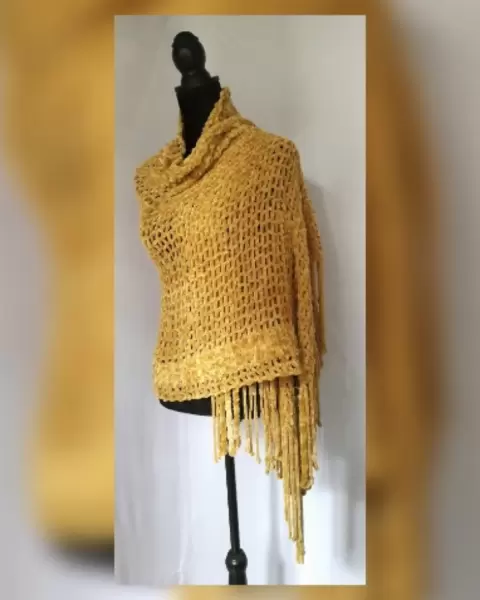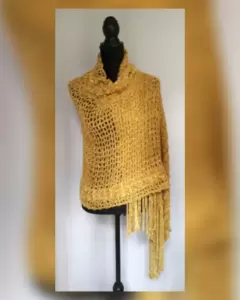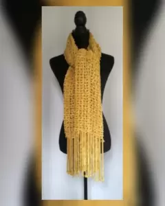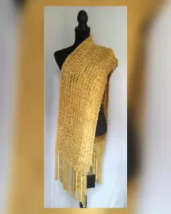 Chal efecto rejilla color TRIGO DORADO c/aplique de flecos. Se puede usar también como bufanda. Unitalla. Dimensiones cms: 73 ancho, 185 cms largo. 100% poliéster. Para lavado en casa.