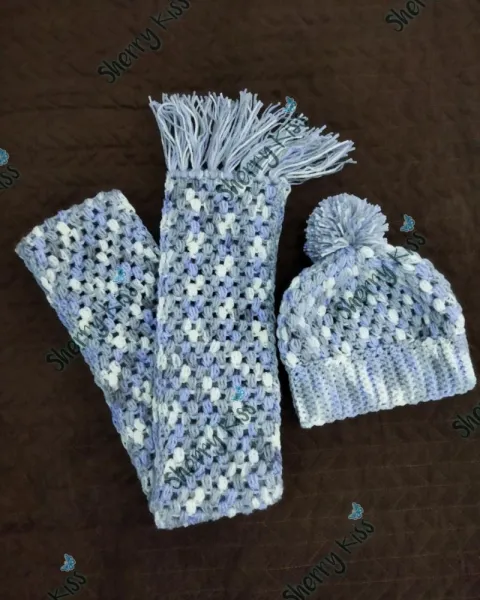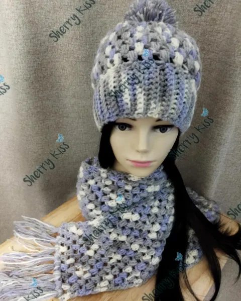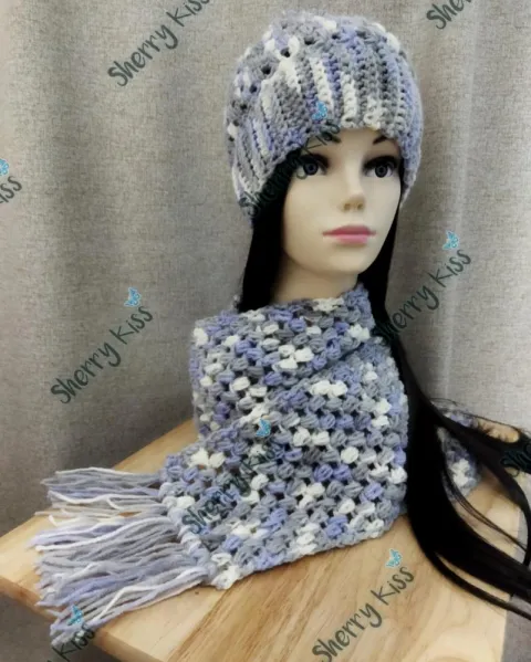 Coordinado de bufanda y gorro tejidos a mano. Color: Matizado lavanda/gris claro/blanco. El gorro es corto (altura de desde coronilla hasta cubrir orejas 21 cms. aprox., incluye pompón hecho del mismo estambre.Medidas bufanda:170cms aprox. (Sin contar flecos)Largo de los flecos: 12 cms aprox de cada lado. Largo total: 194cms aprox.Ancho: 15cms aprox.Gracias!