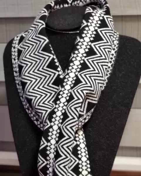 Elegante cuello/bufanda infinity. Elegante bufanda tipo infinity, que funciona como cuello, sobre cualquier otra prenda.Esta fabricada en una composición de 70%rayón y 30% poliester, tiene un diseño geometrico de grecas, en color blanco y negro.El tejido es suave al tacto, cómodo y abrigador, será el complemento ideal para cualquier outfit de otoño-invierno.Mide 50 cms. x 10 cms.