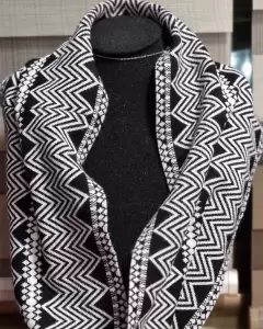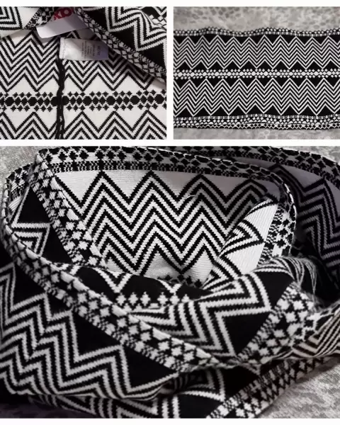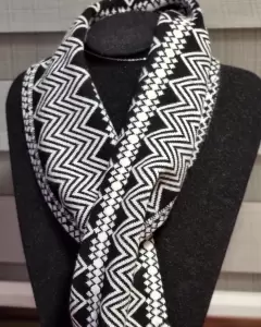 Elegante bufanda tipo infinity, que funciona como cuello, sobre cualquier otra prenda.Esta fabricada en una composición de 70%rayón y 30% poliester, tiene un diseño geometrico de grecas, en color blanco y negro.El tejido es suave al tacto, cómodo y abrigador, será el complemento ideal para cualquier outfit de otoño-invierno.Mide 50 cms. x 10 cms.