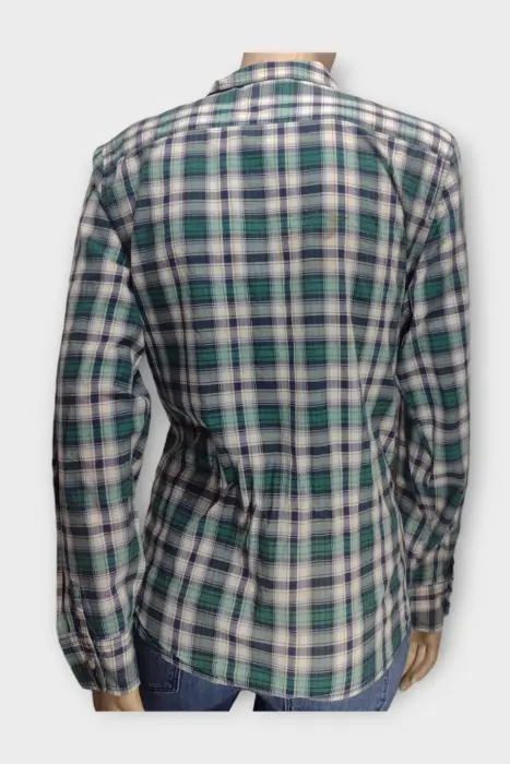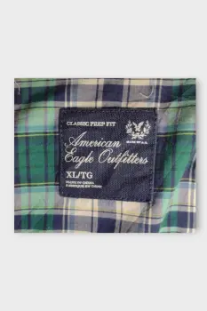 American Eagle Camisa Dama Algodón Cuadros XLCamisa marca American Eagle 100% Algodón a cuadrosMarca: American EagleOrigen: ChinaMaterial: 100% AlgodónTalla: XLEstilo: Camisa Patrón: CuadrosColor: Verde y Azul Cierre: BotónPecho: 56 cmLargo: 70 cmHombro: 42 cmManga: 66 cmRopa de USO en muy buen estado