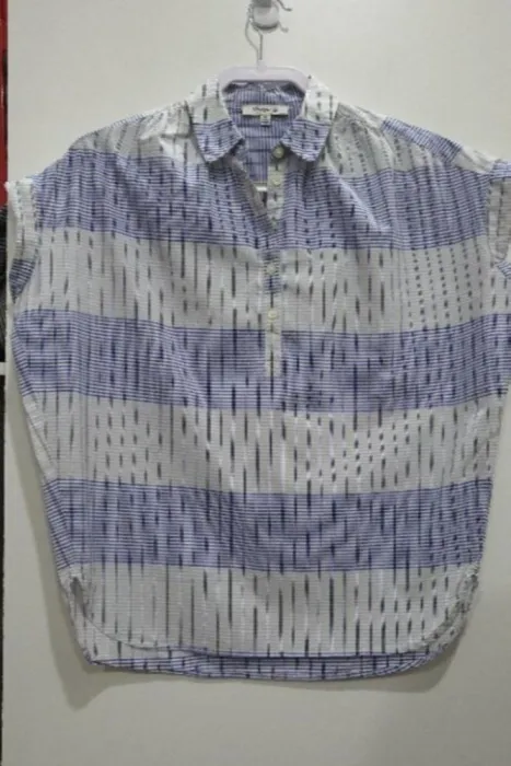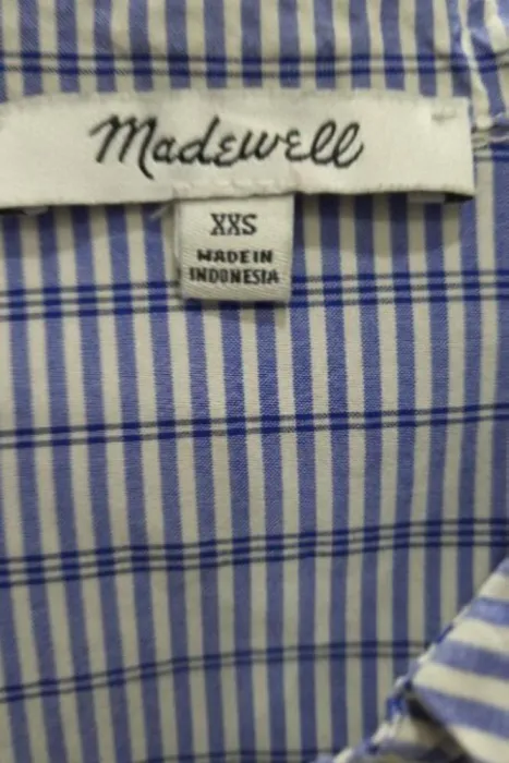 Blusa camisera marca MadewellEl estampado es a rayas en tonos de azulManga corta100% algodónTalla XXS pero viene amplia. Yo la recomiendopara S.Medidas aproximadas: 58cm de axila a axila,se reduce a 52cm en la parte de abajo,65cm de largo desde el hombro.*TODAS MIS PRENDAS SE DESINFECTAN CON LYSOLLAVANDERIA PARA TU MAYOR TRANQUILIDAD*
