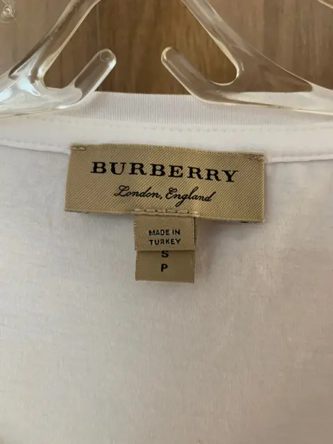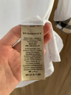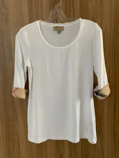 Blusa burberry. Preciosa blusa burberry en color blanco con novacheck en los puños, mangas 3/4 talla S detalle mínima manchita en la espalda casi no se nota y en la manga así me la regresaron de la Tintoreria