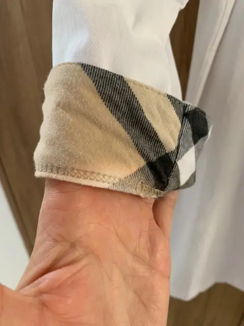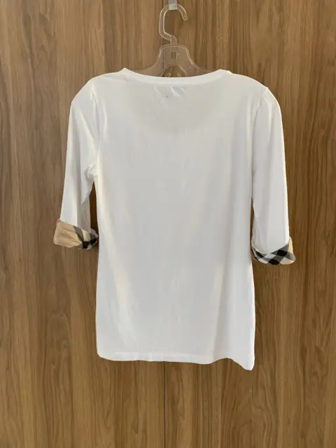 Preciosa blusa burberry en color blanco con novacheck en los puños, mangas 3/4 talla S detalle mínima manchita en la espalda casi no se nota y en la manga así me la regresaron de la Tintoreria