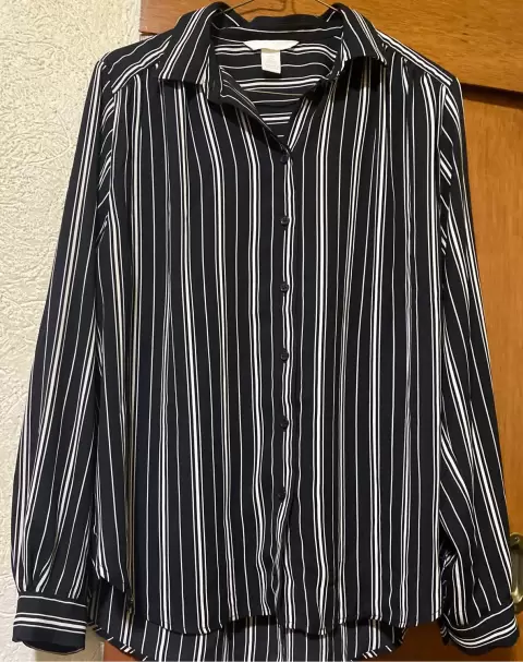 Blusa/ camisa de vestir. Blusa/camisa de vestir, negro con rayas blancas. Cuello, ideal para un traje sastre. Tela fresca y manga larga. Con botones al frente y en las mangas.