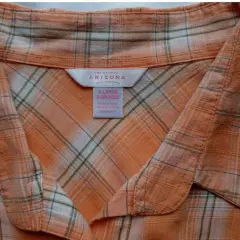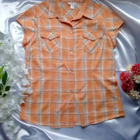 Blusa tipo cawboy, con cuadros naranja con blanco, lindos botones de presion aperlados, la etiqueta marca L, pero queda bien a una talla M