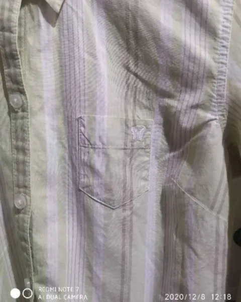 Blusa formal de rallas verde con blanco, cuenta con una bolsa en el lado izquierdo la cual presenta un detalle bordado (mariposa), se encuentra en muy buen estado.