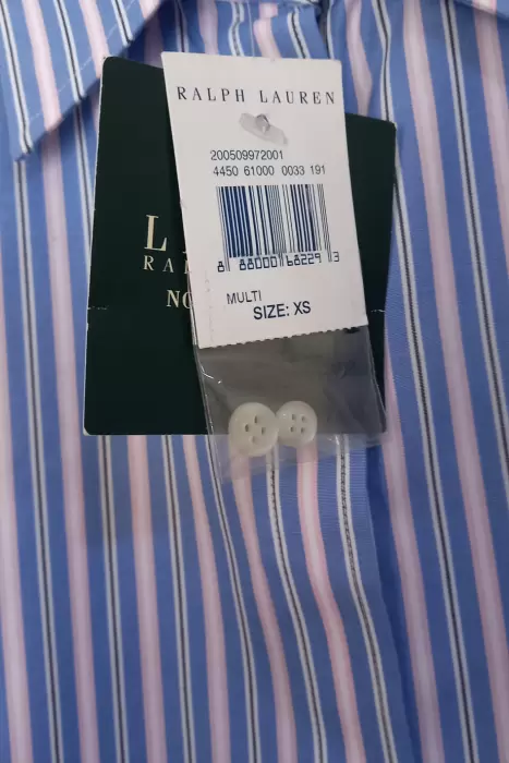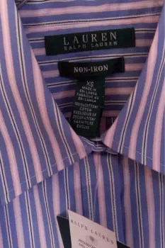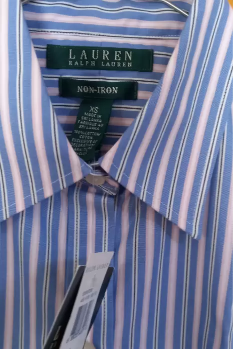 Blusa Ralph Lauren Non Iron. Algodón, motivo de franjas estilo caramelo, logo bordado en el pecho, cuello clásico, cierre con botones en la parte delantera y dobladillo curvo. Talla XS , nueva con etiqueta.