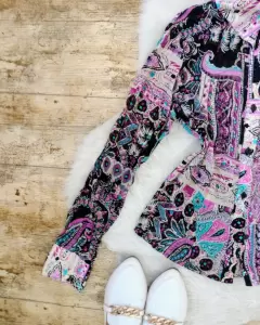 Hermosa blusa con botonesEstampado increíble colores morados y dorados, sin detalles un par de puestas.Dice talla M recomiendo a talla S y XS