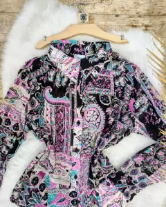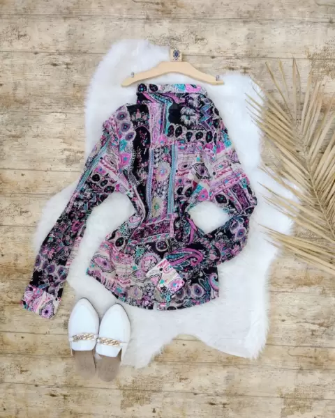 Blusa tipo camisa morada con estampado. Hermosa blusa con botonesEstampado increíble colores morados y dorados, sin detalles un par de puestas.Dice talla M recomiendo a talla S y XS