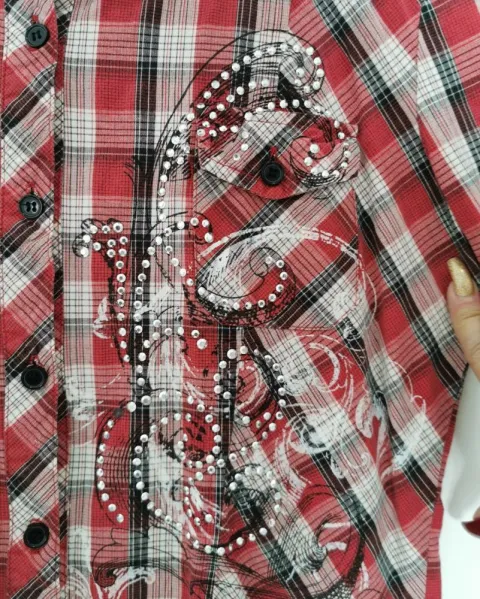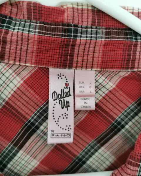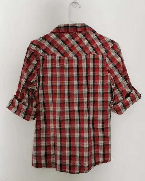 Blusa a cuadros rojos y blancos, con bolsillos de parche con solapa y boton al pecho. Mangas 3/4 con cintilla y botón para sostenerlas dobladas, no tienen puños. Tiene un dibujo y detalle de pequeños estoperoles al frente. Talla L.