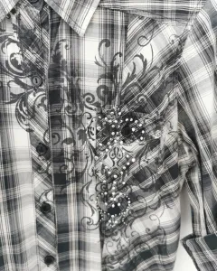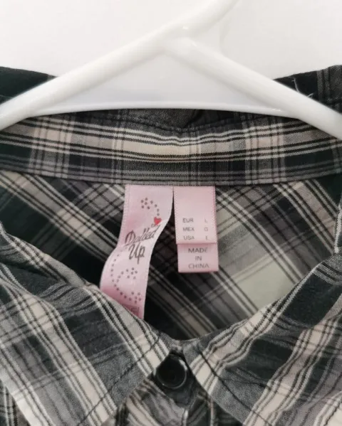 Blusa a cuadros negros y blancos, con bolsillos de parche con solapa y boton al pecho. Mangas 3/4 con cintilla y botón para sostenerlas dobladas, no tienen puños. Tiene un dibujo y detalle de pequeños estoperoles al frente. Talla L.
