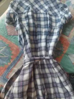 Bonita blusa a cuadros, ligeramente larga, con botones y listón para la cintura, puesta una vez.