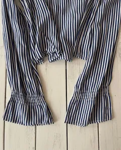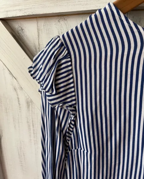 Talla: STela suave y fresca, base blanca y rayas azules.En el puño izquierdo el resorte se aflojó. Se abotona en el cuello por atrás.Medidas: 38 cm de hombros, 47 cm de axila y 46.5 cm de largo.