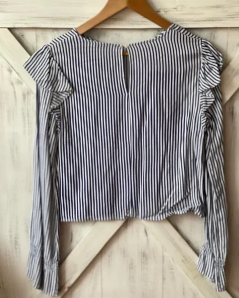 Camisa a rayas azules Bershka. Talla: STela suave y fresca, base blanca y rayas azules.En el puño izquierdo el resorte se aflojó. Se abotona en el cuello por atrás.Medidas: 38 cm de hombros, 47 cm de axila y 46.5 cm de largo.