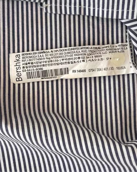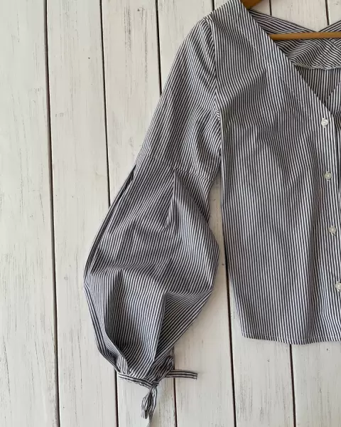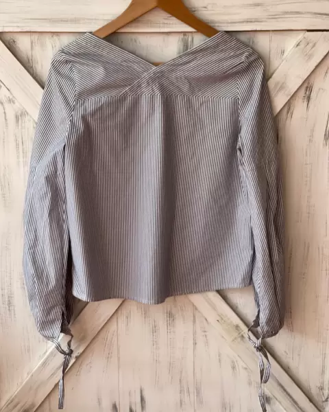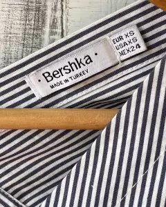 Camisa a rayas Bershka. Camisa escote delantero y trasero en V, las mangas vienen amplias y traen un listón para abrocharse. Talla: XS Medidas: 36 cm de hombros, 47 cm de axila y 57.5 cm de largo.