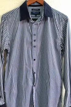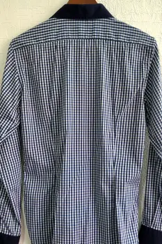 Camisa de cuadros pequeños, color azul. Marca Aldo ContiMangas y cuello color azul rey.Viene de corte largo...Straight fit semiajustadoEn excelente estado.Talla M ó 16-18 años