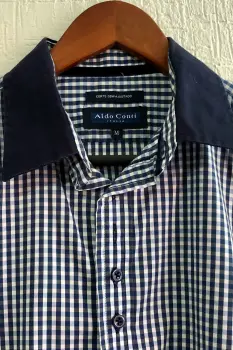 Camisa Aldo Conti - hombre. Camisa de cuadros pequeños, color azul. Marca Aldo ContiMangas y cuello color azul rey.Viene de corte largo...Straight fit semiajustadoEn excelente estado.Talla M ó 16-18 años
